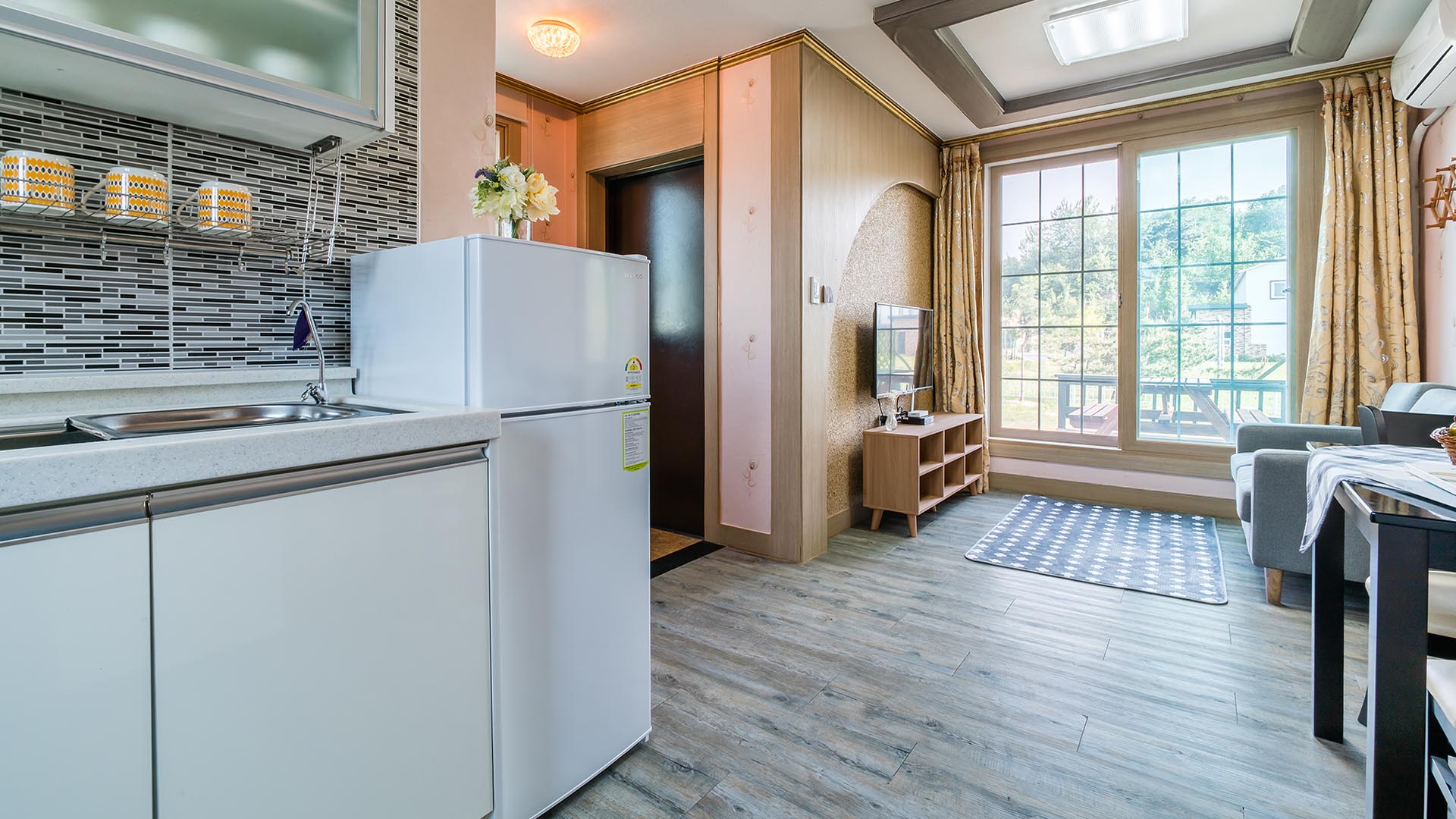 TV, 에어컨, 냉장고, 전기밥솥, 식기류, 전기 인덕션레인지, 헤어드라이기, 커피포트, 수건, 비누, 샴푸, 바디폼클렌징