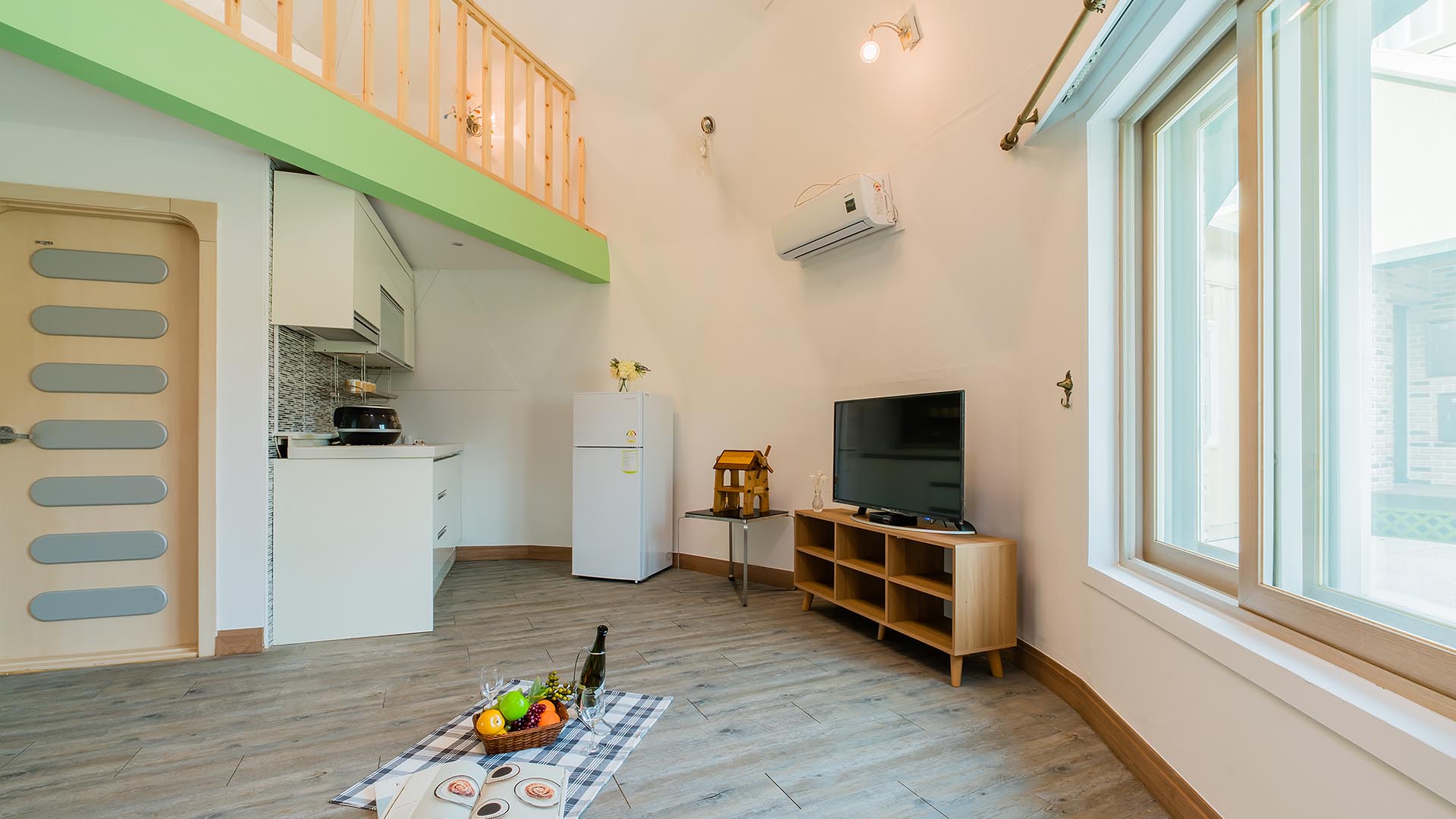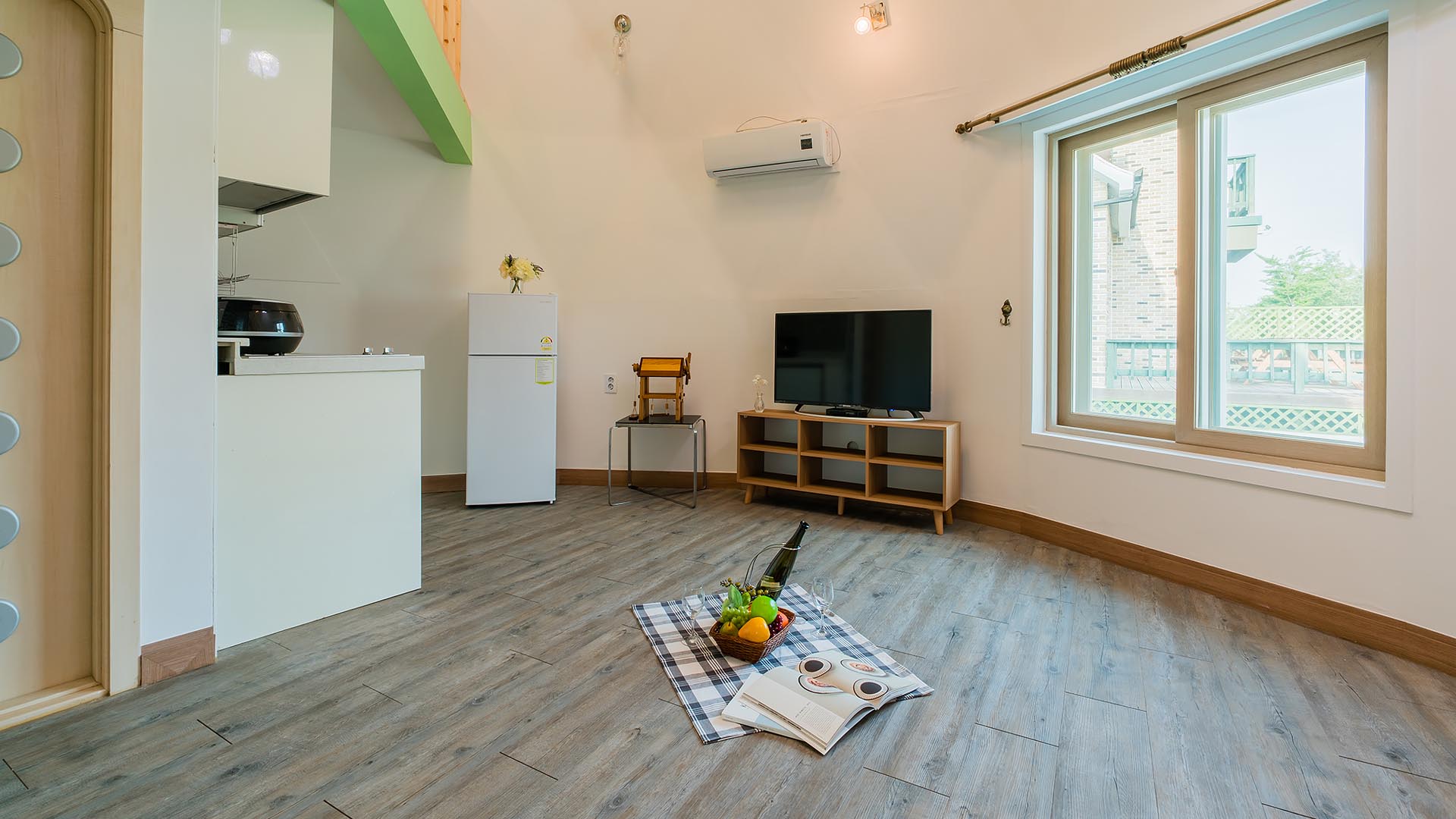 TV, 에어컨, 냉장고, 전기밥솥, 식기류, 전기 인덕션레인지, 헤어드라이기, 커피포트, 수건, 비누, 샴푸, 바디폼클렌징